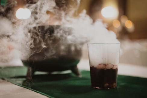 Along the perimeter of the dance floor were tables with countless other Hogwarts goodies such as the enchanted flying keys in a bird cage, Fawkes the Phoenix on a perch, The Monster Book, several Mandrake plants, racks of glassware full of ingredients and potions, and dozens of other detailed goodies. A life sized Dobby holding a sock stood next to the fireplace, which was full of acceptance letters to Hogwarts. There was also a massive hippogriff outside that looked like it came straight off the movie set! Also, their signature drink was a huge hit. It was a Sangria, courtesy of The Bartending Services of New England, but with some dry ice thrown in to give a fun smoky effect.