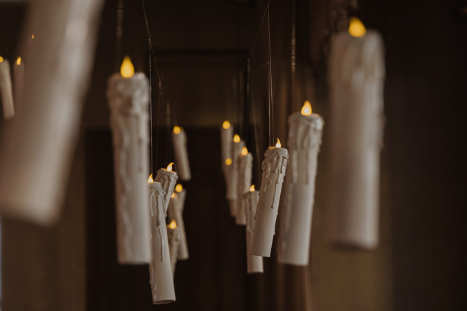 Following the ceremony, each guest was handed their very own one of a kind handmade wand. As they continued into the church, The Great Hall of Hogwarts opens up adorned with candelabras, themed cookies and floating candles above the head table.
